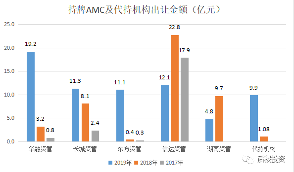二級市場中,華融資管、長城資管與東方資管出讓金額逐年遞增,信達資管經過17、18年釋放大量庫存后,19年出讓金額明顯下滑,相比18年,湖南資管19年出讓金額減少約5億元,代持機構出讓金額增加約9億元。