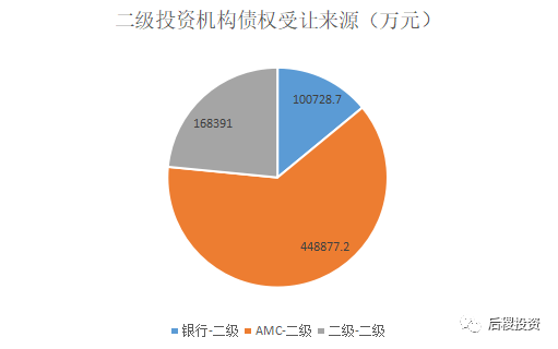 根據已有數據顯示,二級市場總成交303戶,總成交金額68億余元。成交規模最大的為持牌AMC-二級投資機構,成交金額在二級市場中占70%。對比18年,二級市場總量增加約23億元,其中持牌AMC-二級投資機構增加17億元;持牌AMC-其他減少10億元;代持平臺-二級投資機構增加8億元。