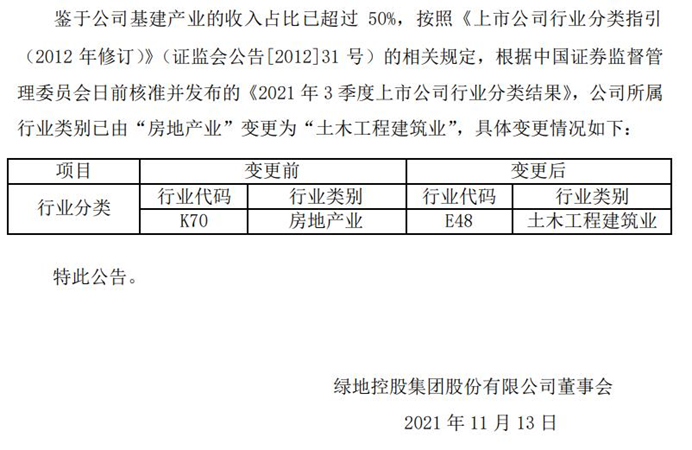11月12日,綠地控股集團股份有限公司發布公告稱,公司所屬行業類別已由“房地產業”變更為“土木工程建筑業”。