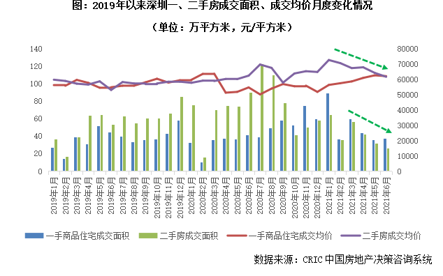 據(jù)CRIC監(jiān)測數(shù)據(jù),自深圳新政發(fā)布以來,二手房成交量節(jié)節(jié)下滑,2021年6月單月僅成交26萬平方米,處于近年來歷史低位;上半年整體二手房成交量僅為257萬平方米,同比降幅達(dá)36%,可見新政對二手房市場的“殺傷力”比“新冠疫情”還要猛烈。二手房成交均價如是,在“指導(dǎo)價”出臺后,整體成交均價穩(wěn)步回落,至6月末已低于新房成交價格,“一二手倒掛”不復(fù)存在。