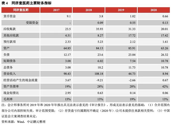 同濟堂醫藥原為湖北同濟堂投資有限公司(簡稱 “同濟堂控股”)控股的子公司,2016年,同濟堂控股將同濟堂置入新疆啤酒花股份有限公司,實現借殼上市。新疆啤酒花股份有限公司,為新疆較早的上市公司之一,原主營業務啤酒釀造銷售、果蔬飲品加工等,與同濟堂控股進行資產重組后更名為新疆同濟堂健康產業股份有限公司(簡稱“同濟堂”),出售持有的烏蘇啤酒全部股權(占該公司股權的50%)給嘉士伯,轉而持有同濟堂100%的股份,變更為醫藥流通企業。目前,同濟堂的主要資產、負債集中于同濟堂醫藥,盈利和經營活動凈現金流亦主要來源于同濟堂醫藥,占比超過90%,其面臨的外部融資環境等亦高度一致,因此同濟堂的償債能力與同濟堂醫藥的償債能力變動趨勢亦基本一致,主體級別于2021年4月同步下調至CC。