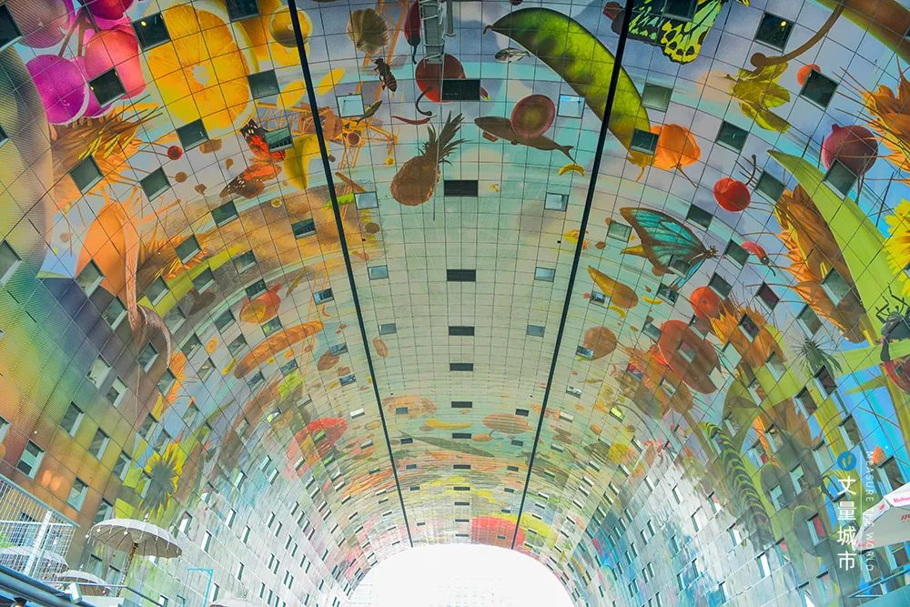 建筑內拱面印著世界上最大的壁畫《豐收之角》,面積達1.1萬㎡,堪稱荷蘭最大的藝術品。這幅如真實影像般逼真的壁畫,由Pixar軟件進行渲染而成,總像素高達400億,文件尺寸達1,470GB!
