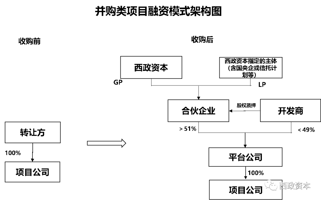 1. 投資架構:西政資本作為GP與其指定的機構(含國央企、信托計劃等)作為LP共同設立合伙企業,合伙企業與開發商共同成立平臺公司,平臺公司通過股權收購方式受讓轉讓方持有的項目公司股權.