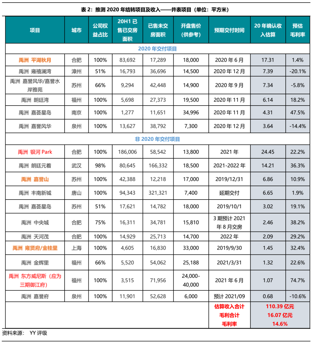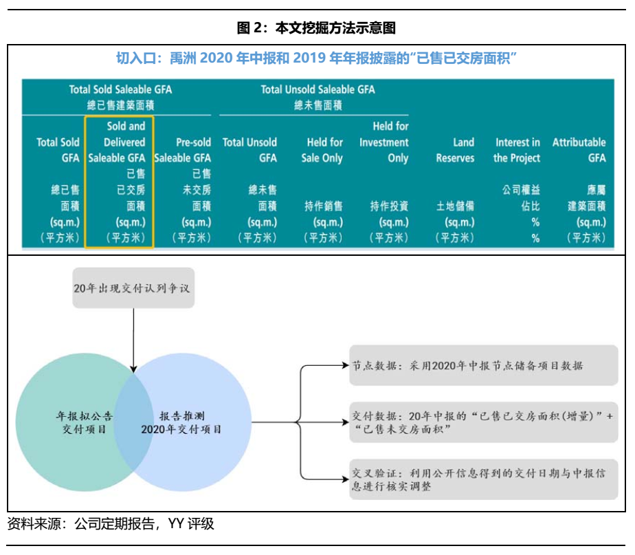 挖掘方法:因房企于資產(chǎn)控制權轉讓至客戶(房屋交付)時確認收入,根據(jù)禹洲定期報告對土儲的詳細披露,我們以“已售已交房面積”為切入口,通過對比2020中報的各項目“已售已交房面積”相對于2019年報相同科目的增量,可以得到2020年上半年交房了一部分的項目。這些項目無論是否并表,均體現(xiàn)在2020年利潤表中。