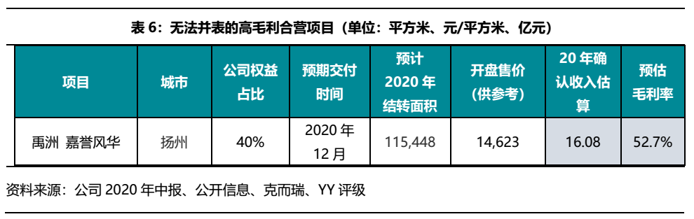 位于揚州的禹洲嘉譽風華項目,截至2020年6月末公司權益占比為40%,公司稱上半年計入非全資子公司,并將收入并表;但是全年審計時,審計師出于謹慎認為未達到并表條件(此時也來不及補充協(xié)議條款)。也就是說,公司原本有把握做并表的項目最后放入了聯(lián)營公司,導致收入無法體現(xiàn)。經(jīng)估算,該項目2020年結轉收入在16億元,毛利在8.5億元,這是2020年結轉的合聯(lián)營項目中為數(shù)不多的高毛利項目。