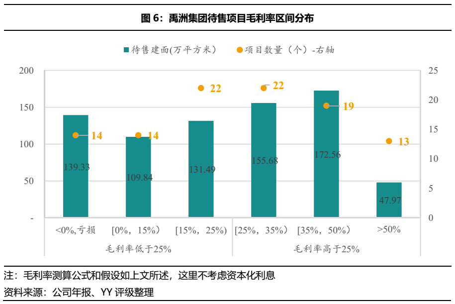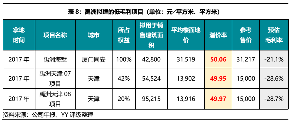 如此簡單估算下來,18個并表項目中有11個項目毛利率不足25%(參見下表),甚至部分項目已然虧損,如漳州的雍禧瀾灣、泉州的嘉譽風華和嘉譽府,以及蘇州的嘉譽風華。公司上述微薄毛利率項目均在其中——合肥的禹洲平湖秋月、蘇州的禹洲嘉譽山、亳州的禹洲名邦狀元府,除此以外,低毛利率項目還包括一些位于福州、蘇州、唐山和合肥的項目。下表項目估算收入合計約86億元,占公司2020年并表營業(yè)收入(104億元)的83%;但預估毛利僅有6.5億元,即毛利率僅7.6%,若再考慮土增稅、銷售渠道費用等,則這些項目盈利更為艱難。