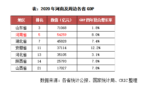 隨著近幾年中原城市群建設的逐步推進,河南省城市規模持續擴大,河南的整體經濟水平穩步增長,2020年河南省的GDP水平為54259億元,排名全國第5,排名在周邊6省中位居第二,且四年GDP復合增速達到8.0%,在周邊地區中僅次于安徽省的12.2%,綜合河南省在全國的GDP排名較為靠前這一因素來看,其四年GDP復合增速在周邊地區屬于較高水平。