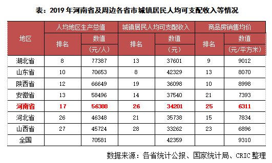 從人均發展水平來看,2019年河南省人均地區生產水平56388元/人,全國地區排名第17,城鎮居民人均可支配收入34201元,排名第26名,在周邊接壤的省份中,人均購買力屬于下游的地位,整體人均購買力較弱。