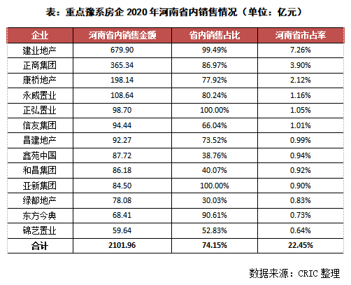 2、豫系房企本省銷售占比超過7成,主要集中在大鄭州