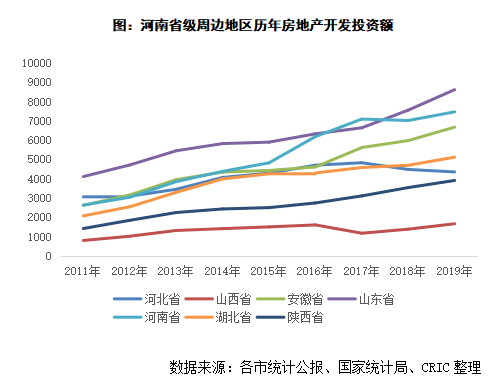 從房地產發展體量上來看,河南省2019年房地產開發投資額7465億元,全國各地區排名第五,房地產市場整體體量較大,同時同周邊6個接壤的省份比較來看,河南僅次于山東省,在中部地區中屬于領先地位。反映到最終的商品房銷售額來看,2019年河南省的商品房銷售額9010億元,全國各地區排名第六,與周邊接壤的省份相比,僅次于山東省。