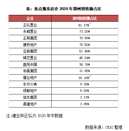 具體來看各企業2020年在河南省內的銷售規模,較為值得注意的是重點豫系房企在大鄭州的銷售額對其省內銷售額的占比達到了57%,排除深耕全省的建業之后甚至能達到69%,是省內銷售貢獻最大的區域。