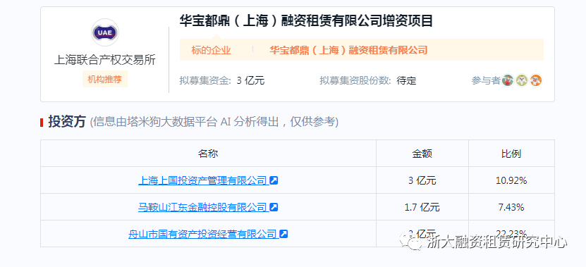 5 | 2021年2月10日 | 華寶都鼎(上海)融資租賃有限公司 | 16億元 | 19億元 | 3 億元 | 擬通過增資擴(kuò)股引入戰(zhàn)略投資者,目前交易所顯示增資已成交,3家戰(zhàn)投總成交金額為7.7億元。 |