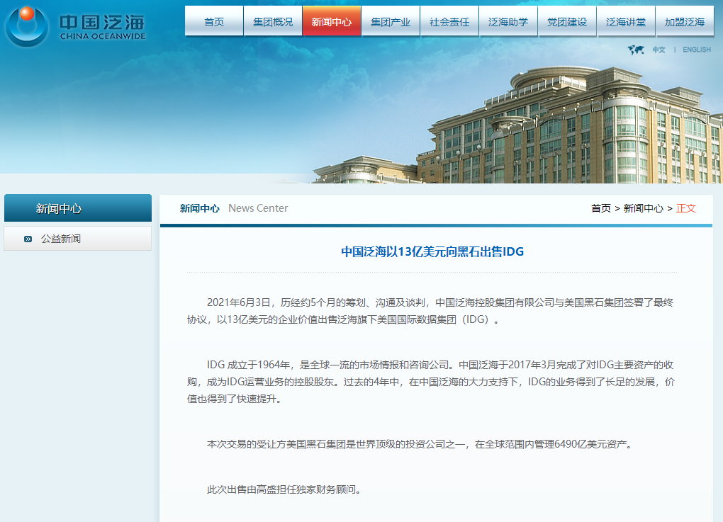 裁判文書網相關文書顯示,2016年8月,泛海集團聯合IDG資本以13.36億美元代價完成對IDG的全面收購,其中泛海既參與了IDG資本對IDG Ventures的收購,又成為了IDG集團旗下傳統業務包括信息技術咨詢業務(國際數據公司IDC)和媒體業務的控股股東。