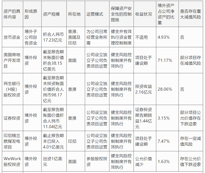 另據年報顯示,泛??毓芍饕木惩赓Y產,包括美國房地產開發項目、證券投資、印尼棉蘭燃煤發電項目、WeWork股權投資在內的占公司凈資產比例總計83.42%的項目均存在減值風險或公允價值下跌跡象。