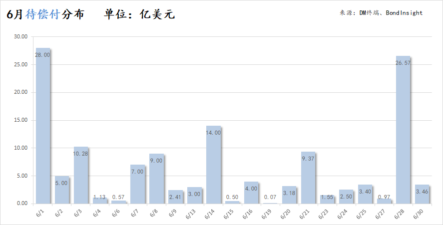 從時間分布上看,償債壓力在6月集中在頭、尾部,分別在6月1日及6月28日出現(xiàn)兩波兌付高峰。其中6月1日單日有4筆債券面臨回售或到期兌付,涉及金額高達28億美元,為本月單日最高待還金額;單日最多筆數(shù)則是6月28日,共計5筆債項需兌付。