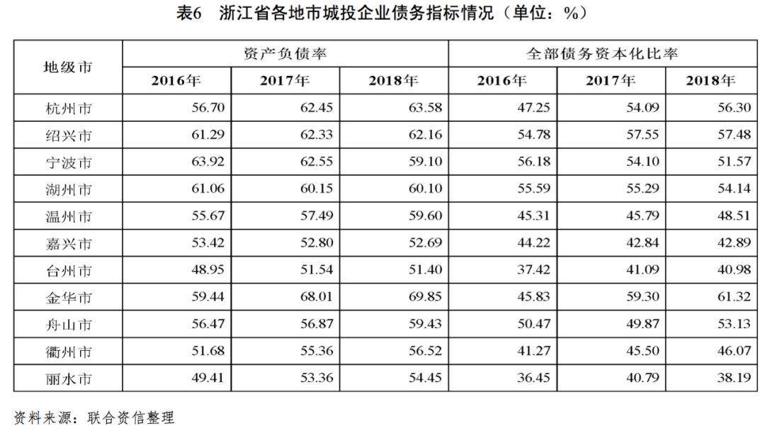 從各地市城投企業債務指標看,2016—2018年,浙江省城投企業整體資產負債率和全部債務資本化比率均呈現上升趨勢,2018年底上述指標分別為60.09%和52.47%。從浙江省各地市債務指標看,2016—2018年金華市城投企業資產負債率和全部債務資本化比率明顯高于其他地市,杭州市、紹興市、湖州市和舟山市城投企業全部債務資本化比率高于浙江省加權平均值。