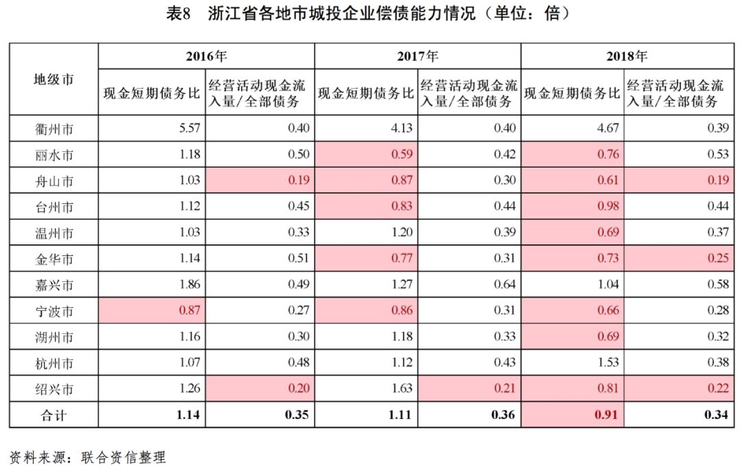 從短期償債能力指標看,2016—2018年浙江省城投企業現金短期債務比持續下降,分別為1.14倍、1.11倍和0.91倍,2017年起各地市城投企業現金類資產無法覆蓋短期債務的情況明顯增多;2018年,除衢州市、嘉興市和杭州市外,浙江省內其余各地市城投企業現金短期債務比均低于1倍,其中舟山市、寧波市、湖州市和溫州市不足0.70倍,短期償債指標較弱。