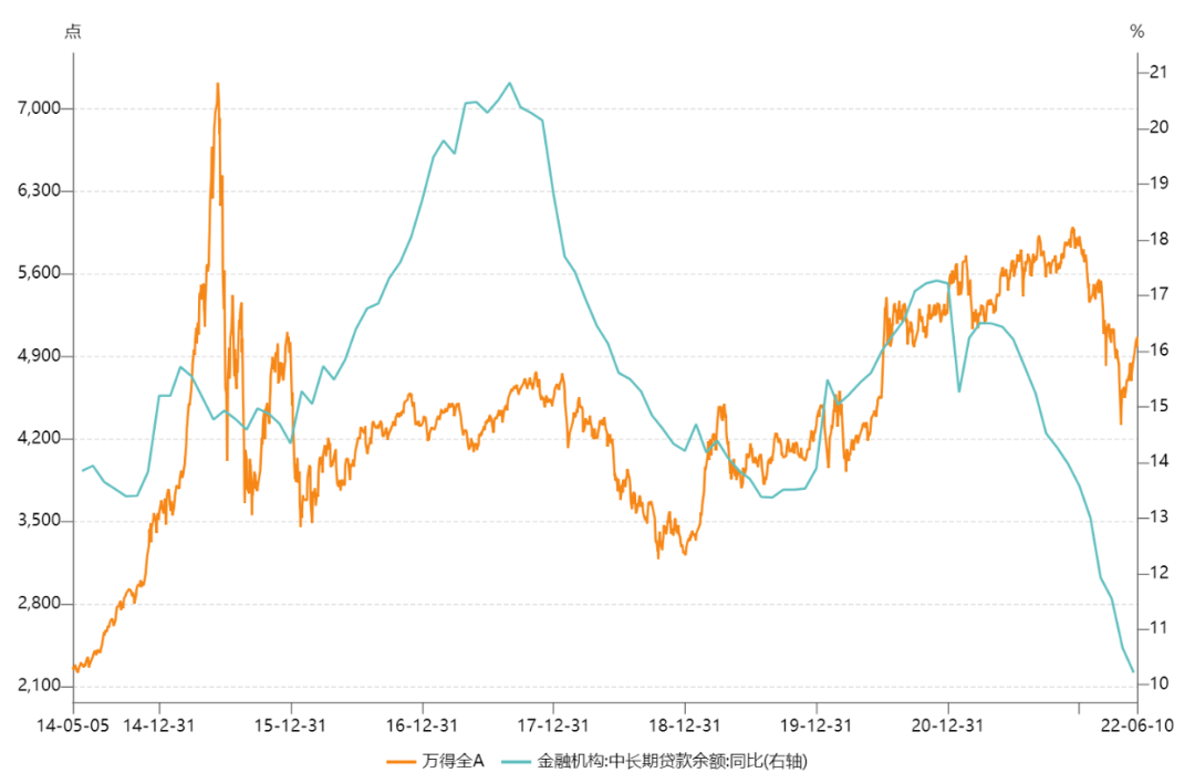 從數據上看就非常明顯,中長期貸款的同比增速是股市的先行指標,同比增速上行的階段股市往往是牛市。