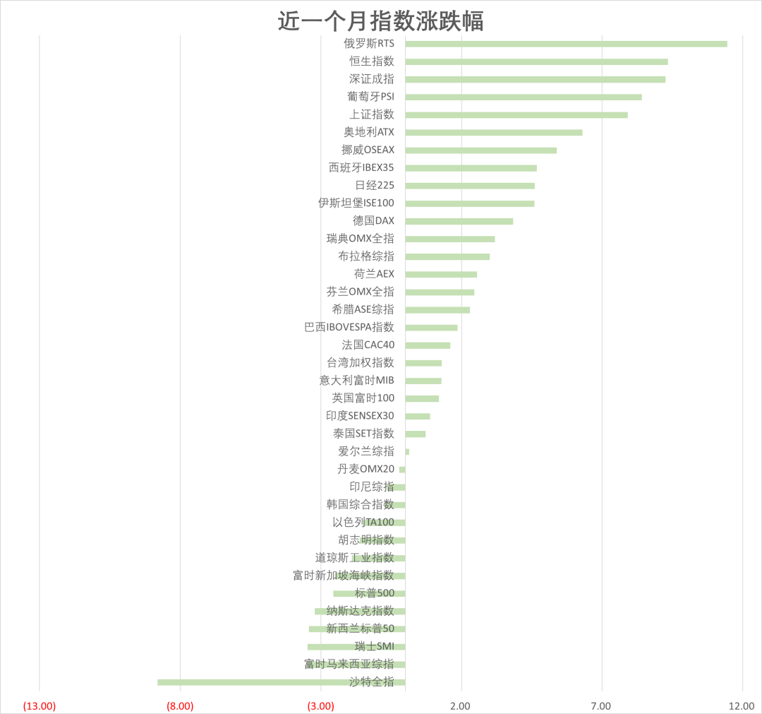 最近一個月,俄羅斯RTS指數上漲11.45%,恒生指數上漲9.33%,深證成指上漲9.26%,占據了全球主要股指漲幅榜前三的位置。