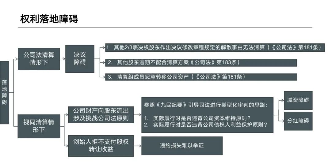 但是,同上文探討一票否決權(quán)落地效果的邏輯一致,在探究完畢其條款法律效力現(xiàn)狀后,我們?nèi)匀贿M(jìn)一步總結(jié)了目前優(yōu)先清算權(quán)實(shí)現(xiàn)過程中存在的實(shí)際障礙與可能的救濟(jì)路徑: