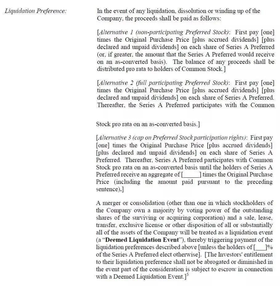 注:美國(guó)風(fēng)險(xiǎn)投資協(xié)會(huì)制定的范本中,沒有中國(guó)本土化優(yōu)先清算權(quán)條款細(xì)化補(bǔ)充的第二次分配實(shí)現(xiàn)方式,即并未有公司全體股東同意清算情形觸發(fā)時(shí)公司定向分紅/減資的約定,也未有視同清算情形下股東間通過贈(zèng)予方式實(shí)現(xiàn)優(yōu)先清算權(quán)原設(shè)計(jì)分配效果的約定,可比對(duì)上文中文示范文本1.1.3、1.1.4條 。