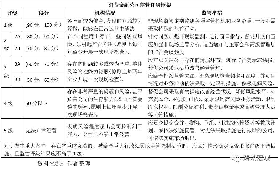 (四)消費(fèi)金融公司:依據(jù)《消費(fèi)金融公司監(jiān)管評(píng)級(jí)辦法(試行)》