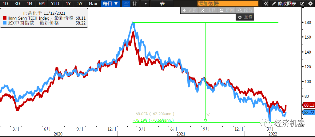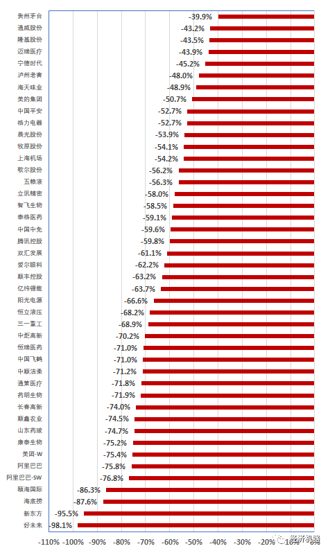 但今年的大會,國內(nèi)的追隨者們似乎低調(diào)了不少。這也難怪,過去一年多來,“時(shí)間的朋友”們所奉為圭臬的“核心資產(chǎn)”和各種茅們出現(xiàn)了幅度驚人的調(diào)整。A股的核心資產(chǎn)指數(shù)下跌了40%(圖1)。
