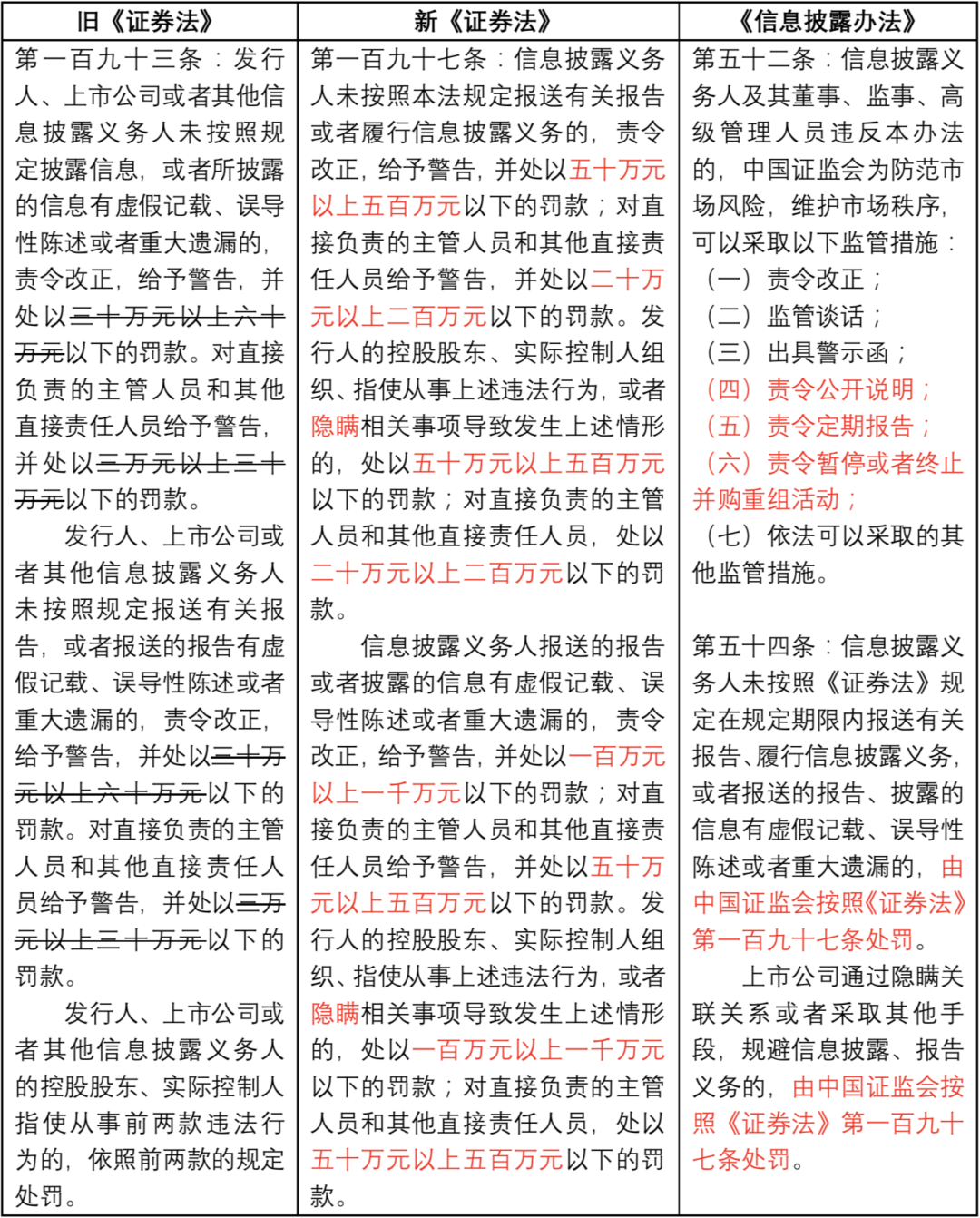 第一,區別對待“未按規定報送和披露”與“報送和披露存在信披違法”兩類處罰標準。舊《證券法》雖然對該兩種情形予以列明,但在行政責任上卻沒有區分。由于后者信息披露義務人的主觀惡意高于前者情形,由此新《證券法》進行差異化處理,后者的責任顯著高于前者,這更有利于防止信披違法。