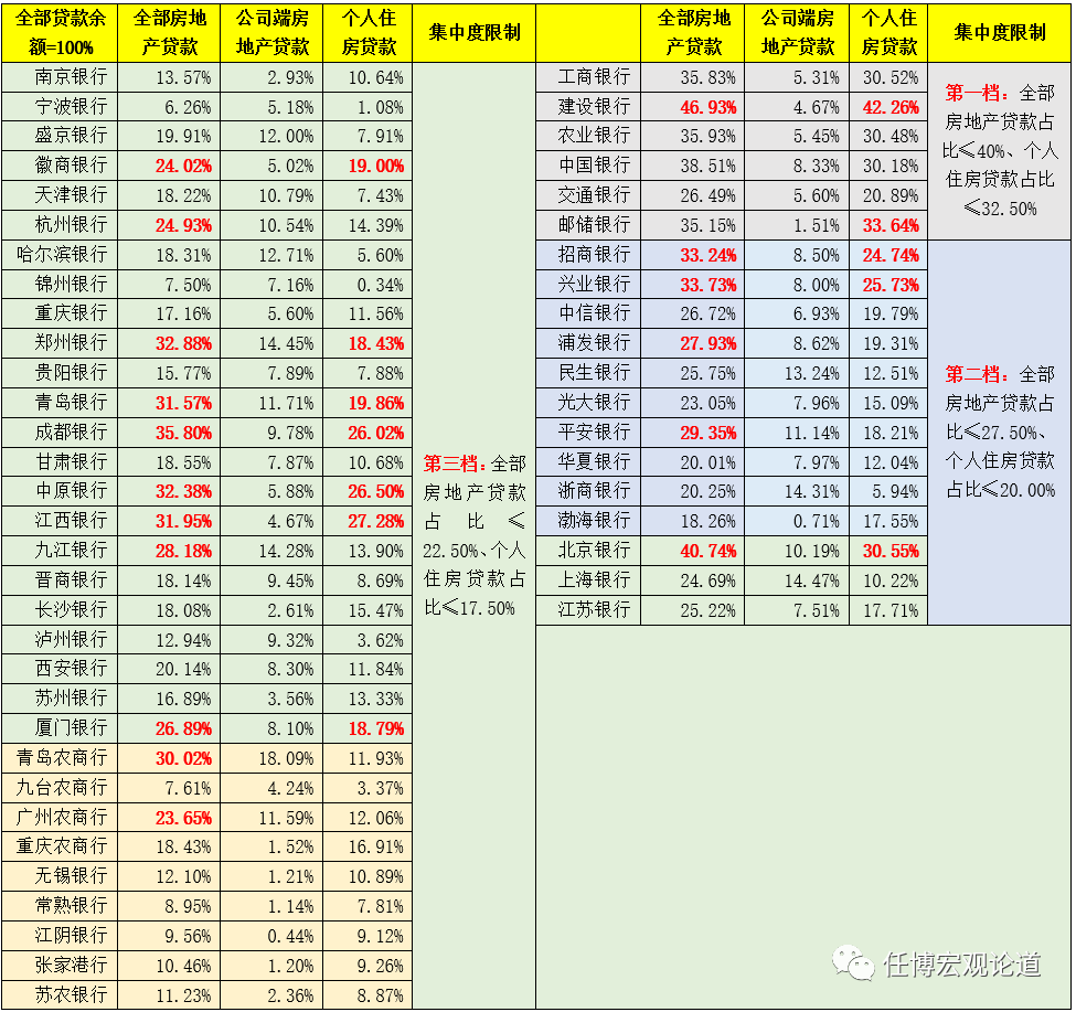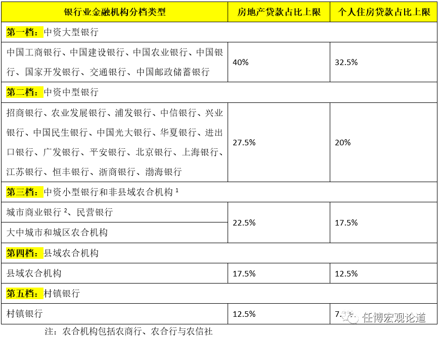(六)322號(hào)文僅提及個(gè)人住房貸款和全部房地產(chǎn)貸款,同時(shí)從比例設(shè)置來(lái)看,第一檔(國(guó)有行)、第二檔(包括3家城商行的中型銀行)、第三檔的對(duì)公端房地產(chǎn)貸款占比上限分別應(yīng)不低于7.50%、7.50%和5%,第四檔與第五檔的對(duì)公端房地產(chǎn)貸款占比上限亦分別應(yīng)不低于5%。因此我們大致可以這樣理解,322號(hào)文同時(shí)對(duì)個(gè)人住房貸款和對(duì)公端房地產(chǎn)業(yè)貸款比例提出了具體約束要求。