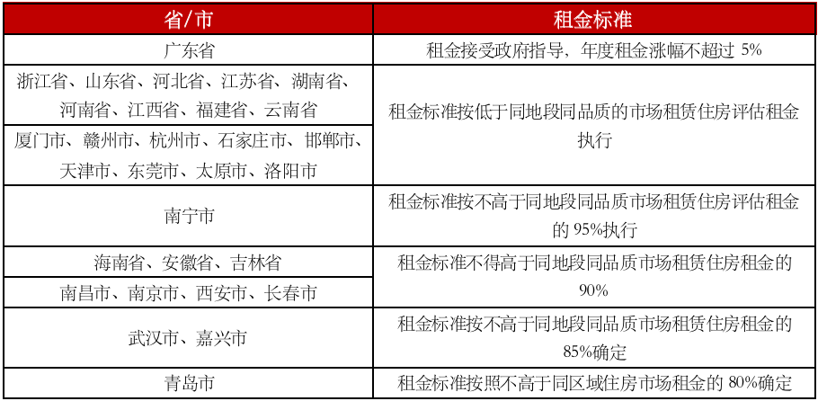 (2)明確保租房租金低于同地段同品質(zhì)市場租賃住房租賃租金。浙江省、山東省、河北省、江蘇省、湖南省、河南省、江西省、福建省、云南省,以及廈門市、贛州市、杭州市、石家莊市、邯鄲市、天津市、東莞市、太原市、洛陽市等省市沿用國辦22號文表述,即“租金標準按低于同地段同品質(zhì)的市場租賃住房評估租金執(zhí)行”。