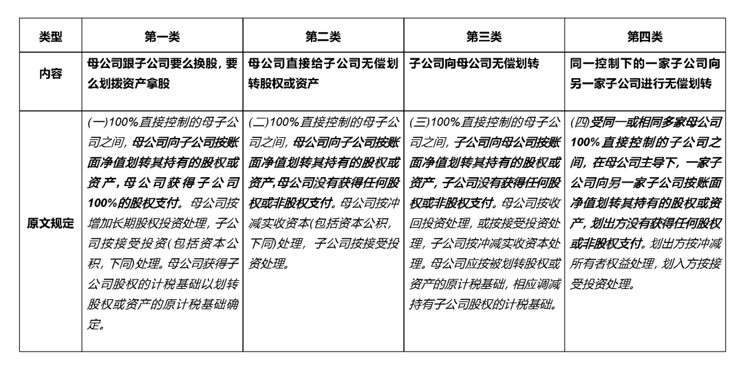 “一、《通知》第三條所稱“100%直接控制的居民企業(yè)之間,以及受同一或相同多家居民企業(yè)100%直接控制的居民企業(yè)之間按賬面凈值劃轉(zhuǎn)股權(quán)或資產(chǎn)”,限于以下情形:”