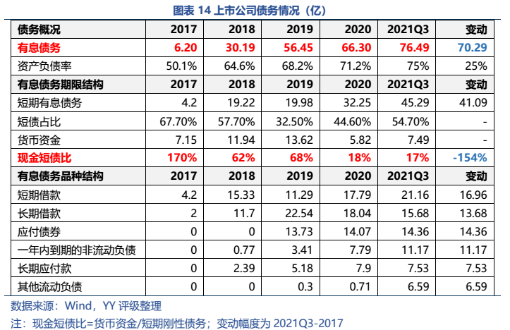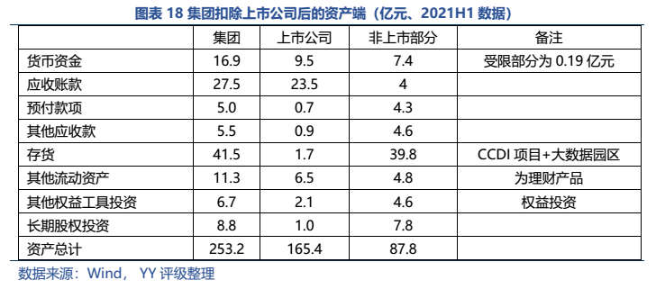 而集團除去非上市公司部分資產主要集中在CCDI產業園項目和大數據園區綜合體項目,母公司資產主要為對上市公司的長投、和對文創置業(產業園項目的建設主體)的應收款。最悲觀來看,市場擔憂成真,上市公司被無償劃出、大數據綜合園區項目后續去化乏力,公司還能獲得CCDI項目的政府補貼、加上已預售的回款和貨幣資金及理財產品,大致能覆蓋母公司層面有息債務;樂觀來看,若上市公司還在集團手里(或轉移獲得一定對價),則能大幅減少償債壓力。