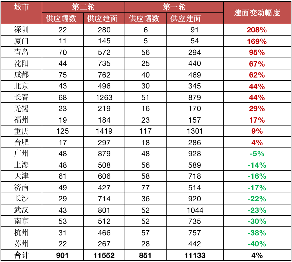 表:第二輪集中供地城市兩次集中供應(yīng)情況對(duì)比(萬(wàn)平方米)