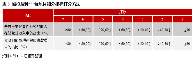 對于城投屬性/平臺地位所涉及的兩個指標(biāo),均取近3年平均值。監(jiān)管環(huán)境持續(xù)收緊的背景之下,很多城投公司為了爭取持續(xù)生存發(fā)展而加快自身轉(zhuǎn)型步伐,有可能在職能定位、業(yè)務(wù)側(cè)重、發(fā)展戰(zhàn)略等多個方面較以往發(fā)生調(diào)整和變化,進(jìn)而對城投公司的城投屬性/平臺地位產(chǎn)生較大影響。不過,即便剔除了監(jiān)管壓力的影響,城投公司業(yè)務(wù)結(jié)構(gòu)和應(yīng)收對象結(jié)構(gòu)本身也都存在較強(qiáng)的波動性,僅考察近1年的情況容易造成判斷失真,故將考察期間拉長至3年,有助于更準(zhǔn)確地把握其城投屬性/平臺地位的真實水平。權(quán)重方面,兩個指標(biāo)之間存在較大差異。之所以對應(yīng)收政府款項占比僅設(shè)置5%的權(quán)重,而非經(jīng)營性業(yè)務(wù)收入占比卻設(shè)置20%的權(quán)重,是因為:在業(yè)務(wù)層面,城投公司和地方政府發(fā)生關(guān)聯(lián)的程度越深,相關(guān)業(yè)務(wù)收入在總收入中的占比越大,就越能強(qiáng)化其城投屬性/鞏固其平臺地位;但應(yīng)收款項層面,雖然應(yīng)收政府款項占比越高確實能反映出城投公司參與地方建設(shè)的程度越深,不過這同時也意味著存在回款較慢、對城投公司形成資金占用的情況,因此本文雖然將該指標(biāo)納入模型,但權(quán)重設(shè)置方面較為謹(jǐn)慎保守。