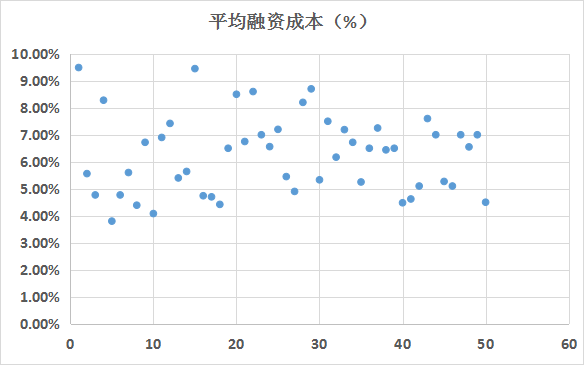 TOP50開發(fā)商2020年平均融資成本介于3.8%~9.49%之間。其中,融資成本最低的是中國(guó)海外發(fā)展,融資成本3.8%,最高的是中國(guó)恒大,融資成本9.49%。融資成本超過7%的開發(fā)商17家,占比34%;融資成本介于5%~7%的開發(fā)商21家,占比42%;融資成本低于4%的開發(fā)商僅1家。