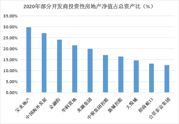 TOP50開發(fā)商2020年投資性房地產(chǎn)凈值占總資產(chǎn)比分化明顯。其中,投資性房地產(chǎn)凈值占總資產(chǎn)比前三位分別為寶龍地產(chǎn)29.85%、中國(guó)海外發(fā)展27.11%、金融街24.13%。占比超過20%的開發(fā)商有4家,占比超過10%的13家。