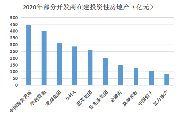 TOP50開發(fā)商2020年在建投資性房地產(chǎn)規(guī)模合計(jì)約為3138億元。其中,在建規(guī)模前三位分別為中國(guó)海外發(fā)展447.79億元、華潤(rùn)置地398.26億元、龍湖集團(tuán)313.96億元,在建規(guī)模在100億級(jí)別以上的開發(fā)商有9家。