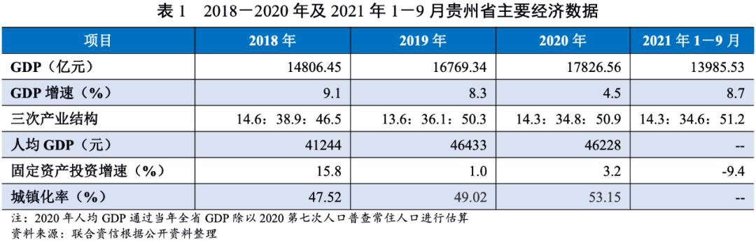 近年來貴州省經濟保持增長,產業結構更趨優化,但整體經濟總量不大,2020年地區生產總值占全國GDP的1.75%,在全國31個省、直轄市、自治區(不含特別行政區)中排名第20位(較2019年躍升2位)。貴州省是傳統的農業大省,近年來大力發展特色農業,第一產業在經濟發展中占據重要地位;由于第一產業享受的稅收優惠政策較多,總體稅負水平相對較低,這一定程度上也影響了貴州省的稅收收入。近年來伴隨著休閑旅游等的發展,貴州省第三產業發展迅猛,但2019年以來第三產業投資負增長,2020年以來新冠疫情對貴州省旅游行業造成較大沖擊(2020年貴州省旅游總收入5785.09億元,同比下降45.6%),短期內對貴州省經濟發展帶來不利影響。