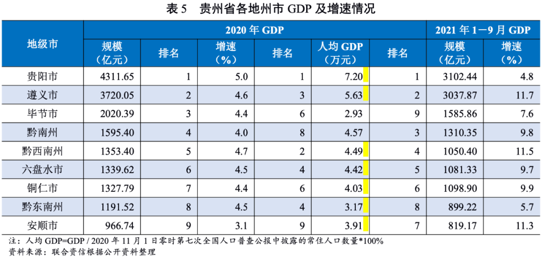 由于貴州省產業發展較大程度依賴于自然稟賦,貴州省內各地州市經濟發展水平相對不均衡。貴州省所轄的六市三州中,貴陽市第三產業占比較高(59.90%),2020年GDP總量及增速指標位列第一。貴陽市和遵義市經濟總量較為接近,為全面提升省會城市經濟首位度,2021年4月,貴陽市政府印發《貴陽市實施“強省會”五年行動方案》,旨在通過大數據引領創新發展、貴陽貴安深度融合等多方面舉措提升貴陽市城市能級,到2025年貴陽市地區GDP達7000億元以上,經濟總量在全國省會城市位次前移,首位度[1]達27%以上(2020年為24.2%)。2021年前三季度,貴陽市主力的第二產業和第三產業增長放緩,固定資產投資同比下降16.8%,GDP增速在各地州市中排名靠后,未來面臨一定增長壓力。