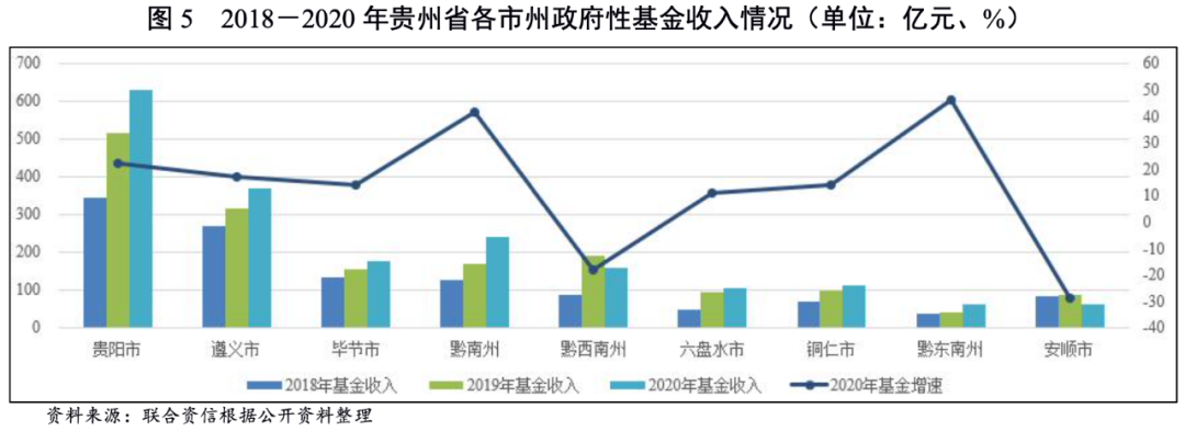 2021年前三季度,僅遵義市、畢節市和黔南州3個地州市披露了政府性基金預算收入,上述地州市政府性基金預算收入同比分別下降33.4%、45.62%和25.3%,主要是由于房地產市場持續低迷,土地市場疲軟導致。