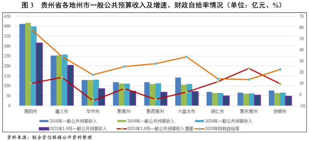 各地州市中,貴陽市和遵義市財政實力較強,一般公共預算收入質量較好,其中貴陽市財政自給率最高,政府綜合財力近一半由政府性基金預算收入貢獻,政府債務負擔較重;其余地州市財政自給率較低,對上級補助收入依賴大。