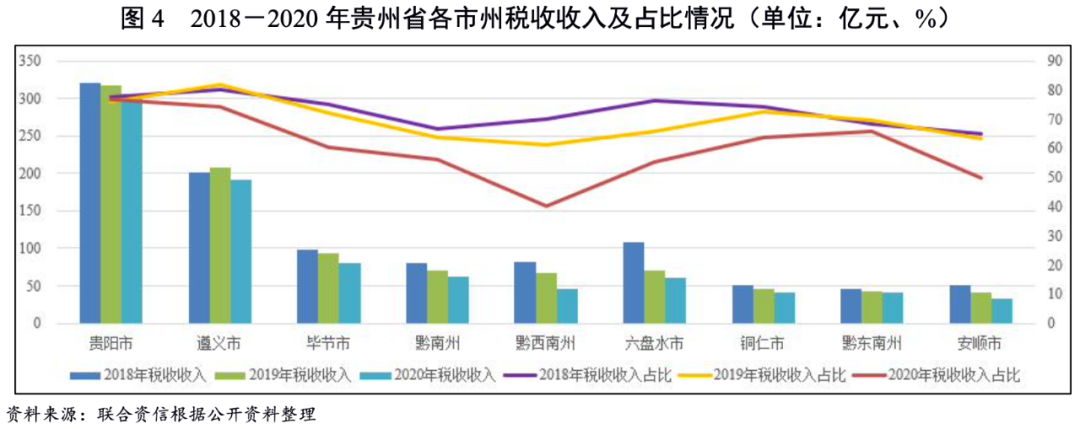 城投企業作為地方基礎設施尤其是公益性項目的投融資及建設主體,日常經營以及債務償還對地方政府有很強依賴,下文通過貴州省以及各地州市財政收入對“地方政府債務+發債城投企業債務”的保障程度來反映地方政府對區域內城投企業全部債務的保障能力。