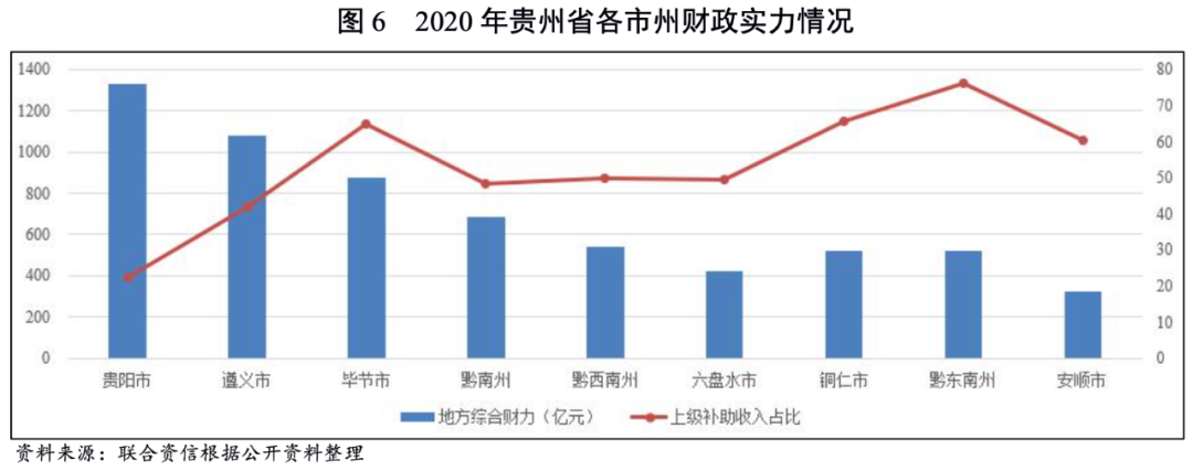 從綜合財政實力看,貴陽市和遵義市綜合財力2020年分別為1326.62億元和1081.33億元,安順市綜合財力規模最小,為322.61億元。除貴陽市外,貴州省其余地州市2020年上級補助收入在綜合財力中所占的比重超過40%,對上級補助依賴較大。