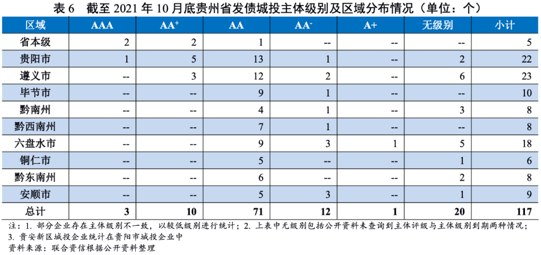 貴州省發債城投企業數量較多,主要分布在貴陽市、遵義市和六盤水市;主體級別以AA為主,2021年以來主體級別發生負面變動的城投企業數量較多。