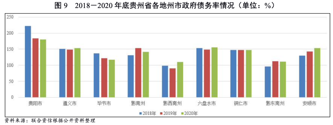 截至2020年底,貴陽市政府債務率最高(180.70%),六盤水市、安順市和遵義市政府債務率在153%~157%之間,黔西南州政府債務率最低(109.89%)。從變化看,貴陽市和畢節市政府債務率逐年下降,除兩者均為政府債務增速最低的地州市外,貴陽市主要受益于政府性基金預算收入規模的擴張,畢節市主要受益于上級補助收入的增長。綜合財力下降疊加債務規模增長影響下,安順市政府債務率2020年較2018年上升23.89個百分點。