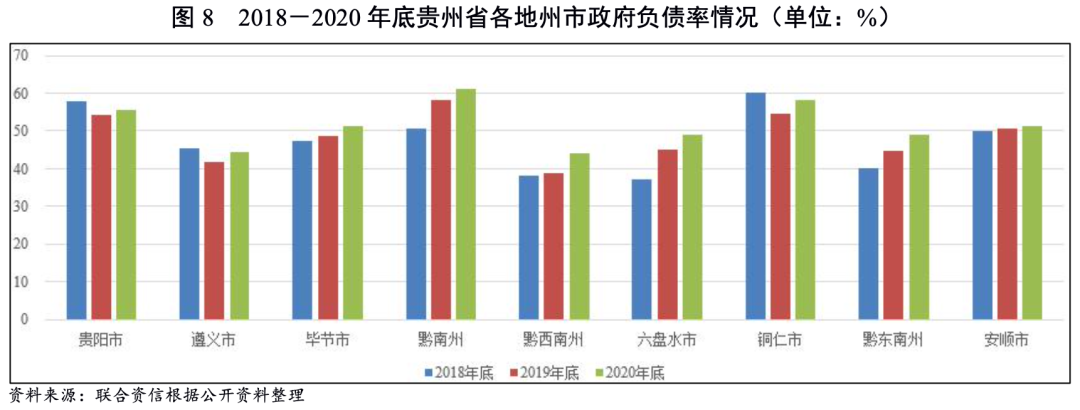 政府負債率方面,受債務規模擴大及新冠疫情導致2020年經濟增速下滑雙重因素影響,2020年底,貴州省各地州市政府負債率均較2019年底小幅上升,其中黔西南州政府負債率上升5.17個百分點,政府負債水平有所提高。各地州市2020年底政府負債率分布在43%~61%之間,其中黔南州最高,黔西南州最低。