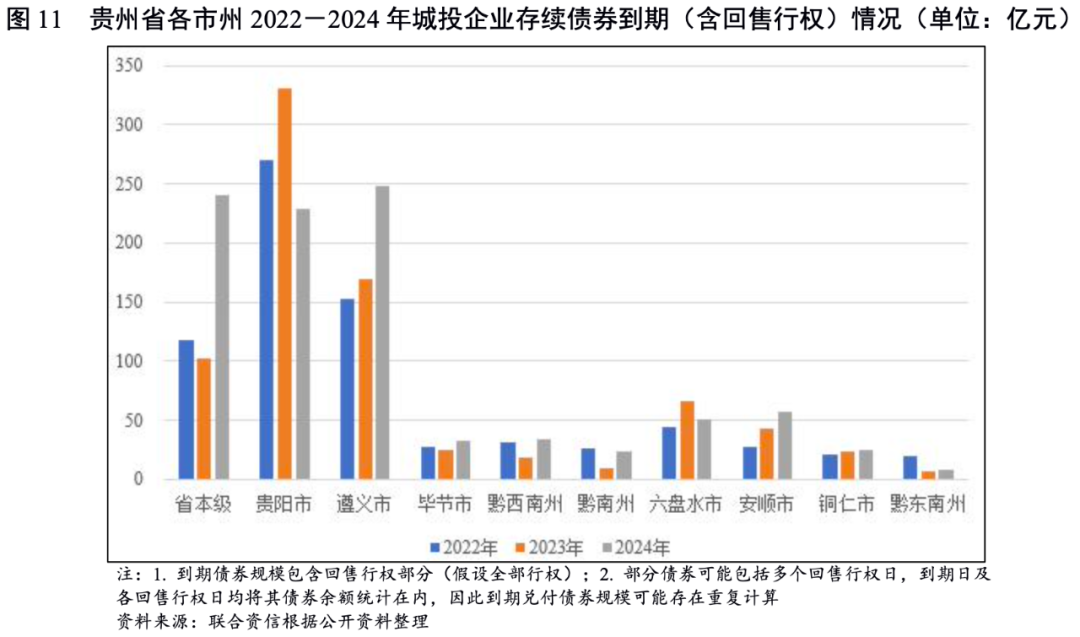 從未來三年債券到期分布看,貴陽市2022-2023年到期兌付債券(含回售行權,下同)規模較大,分別約270億元和330億元,省本級及遵義市2024年到期債券規模相對較大,其余地州市到期債券規模相對較小。
