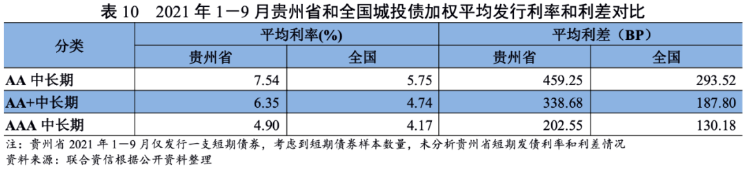 從發行利差看,2021年1-9月,貴州省城投企業發行的AA、AA+及AAA級中長期債券發行利率分別較全國同級別城投企業平均水平高出179BP、161BP和73BP,反映出市場對貴州省城投債券的風險溢價高于全國城投債券。
