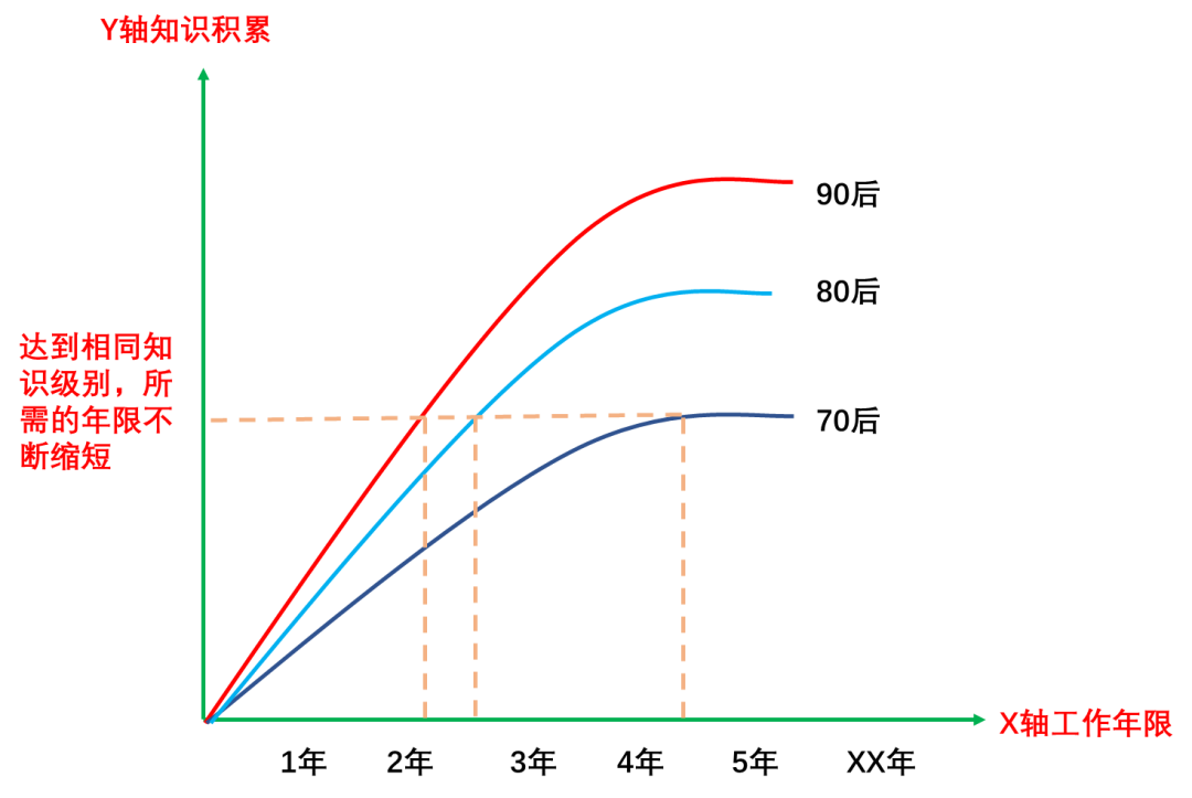 嘗試用下圖總結(jié)這個現(xiàn)象,年輕人的知識積累曲線越來越陡峭,達(dá)到相同知識存量所需要的時間要比前幾代人短的多,所以職場對年輕人的期望也水漲船高。