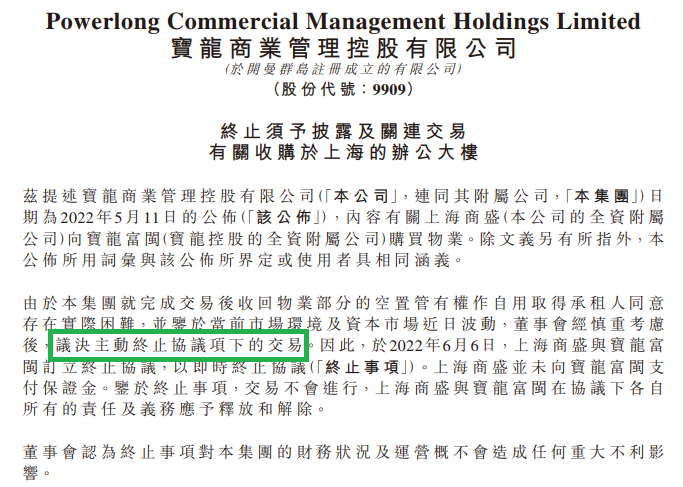 由于集團就完成交易后收回物業(yè)部分的空置管有權作自用取得承租人同意存在實際困難,并鑒于當前市場環(huán)境及資本市場近日波動,董事會經慎重考慮后,議決主動終止協(xié)議項下的交易。因此,于2022年6月6日,公司子公司上海商盛與寶龍控股子公司寶龍富閩訂立終止協(xié)議,以即時終止協(xié)議。上海商盛并未向寶龍富閩支付保證金。鑒于終止事項,交易不會進行,上海商盛與寶龍富閩在協(xié)議下各自所有的責任及義務應予釋放和解除。